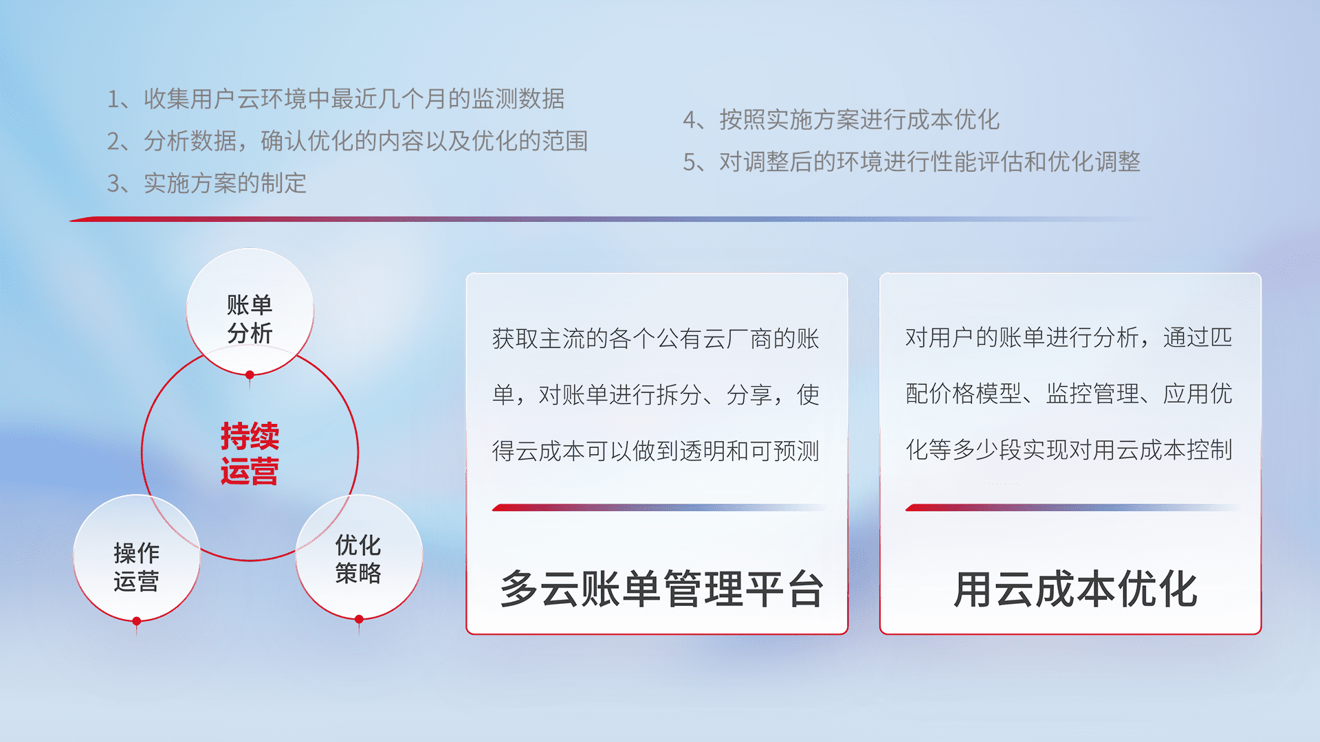 通过多云纳管,,以统一的资源数据模型把客户的云资源进行抽象和封装,,进而实现对多云资源的统一操作,,保障云资源管理的可靠性、、、稳定性与可用性。。。。量身定制化运维内容,,,,配置、、、、开发运维、、补丁管理、、、、备份、、监控、、认证和访问管理、、审计和日常巡检等,,保障在用云过程中的可靠度,,,,稳定度以及高可用率。。